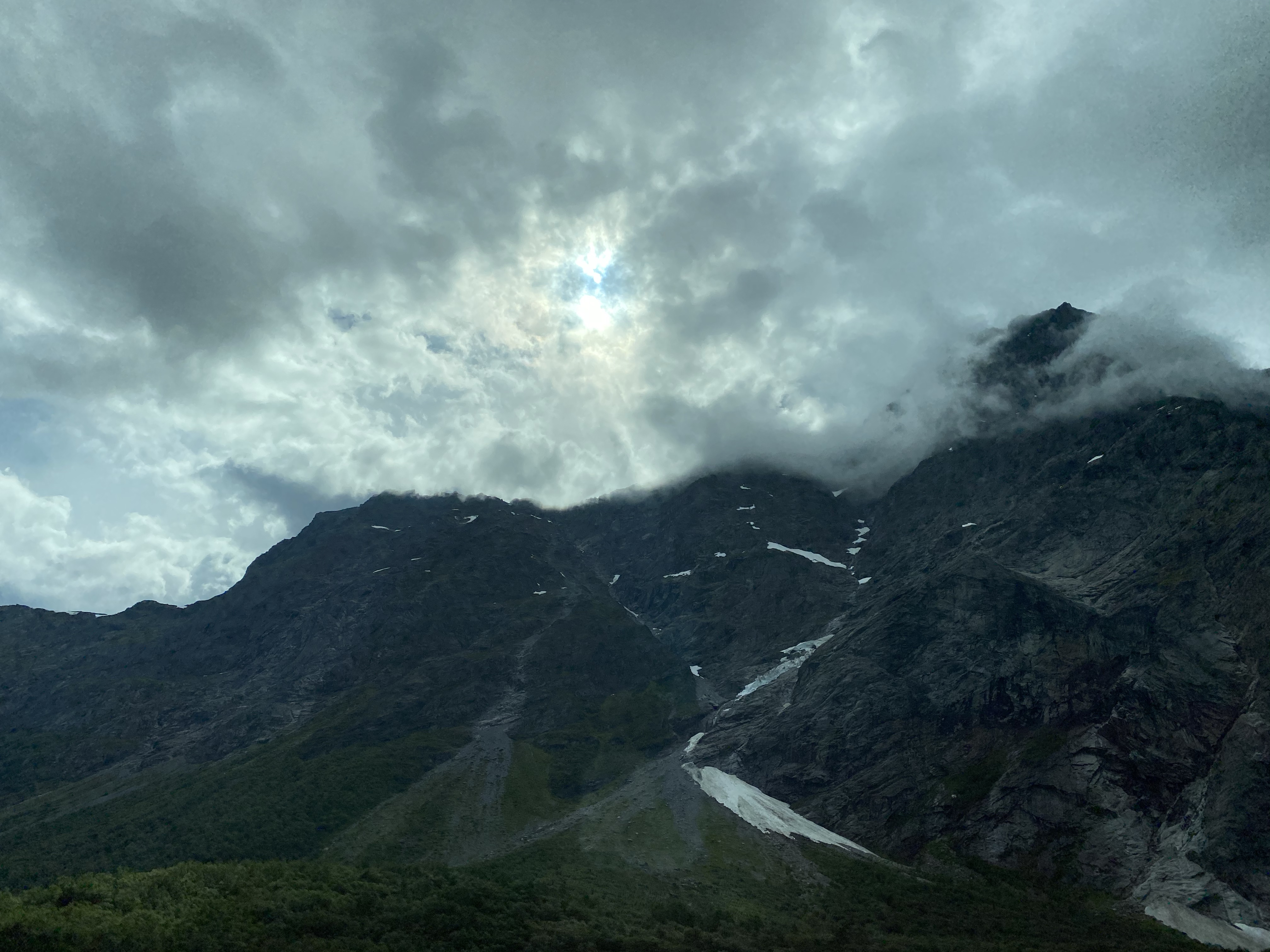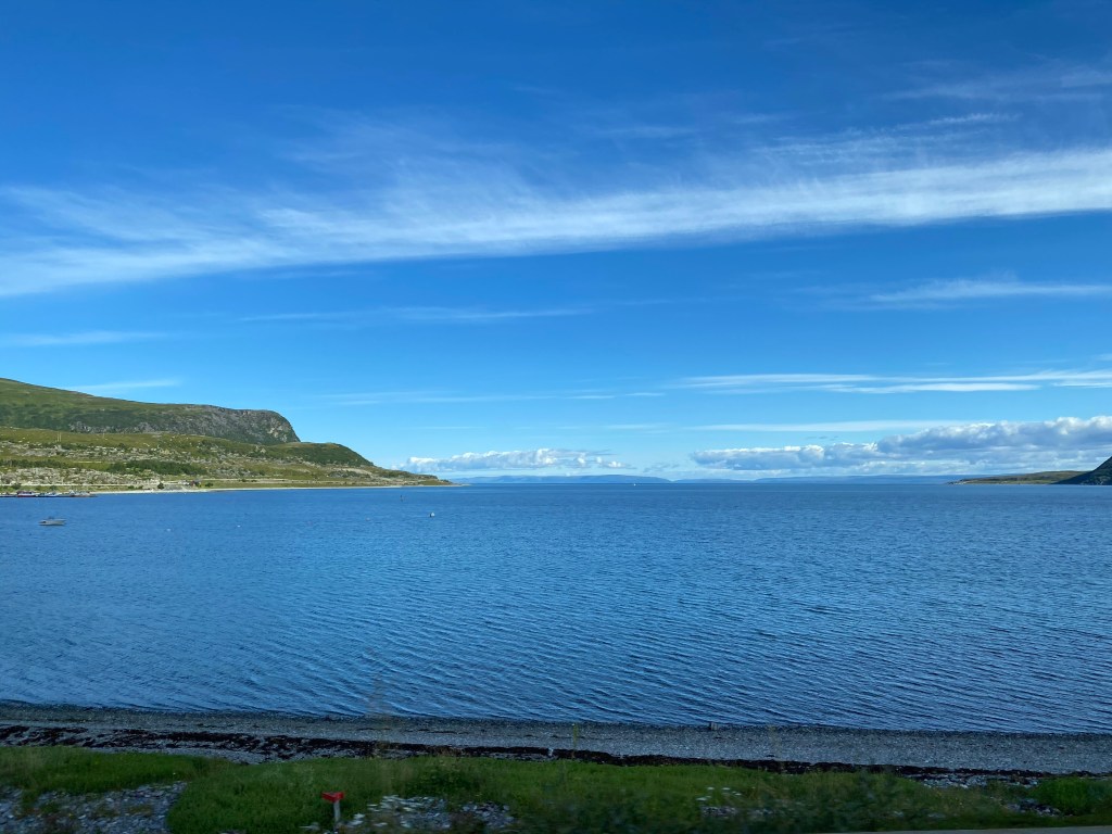 Jølp!!!!! Klokka er 7 😳😴 på morran!!!! Helt utrulig å fint det er med ferie 😬 Men neida, så joda- frokost. Flott buffet på Fru Haugans Hotell i Mosjøen, det skal seias. Bare få ti seg en liter kaffe nå slik att’n får auer som en nyklekke kattunge. Lyt sjå ama, da’n skar kjøre bil. Så vi var på vægen før skolestart vi. Regnvær i dag og ser je. Hele vægen, ja bortsett fra på Saltfjellet da. Der var det kvitt🥶