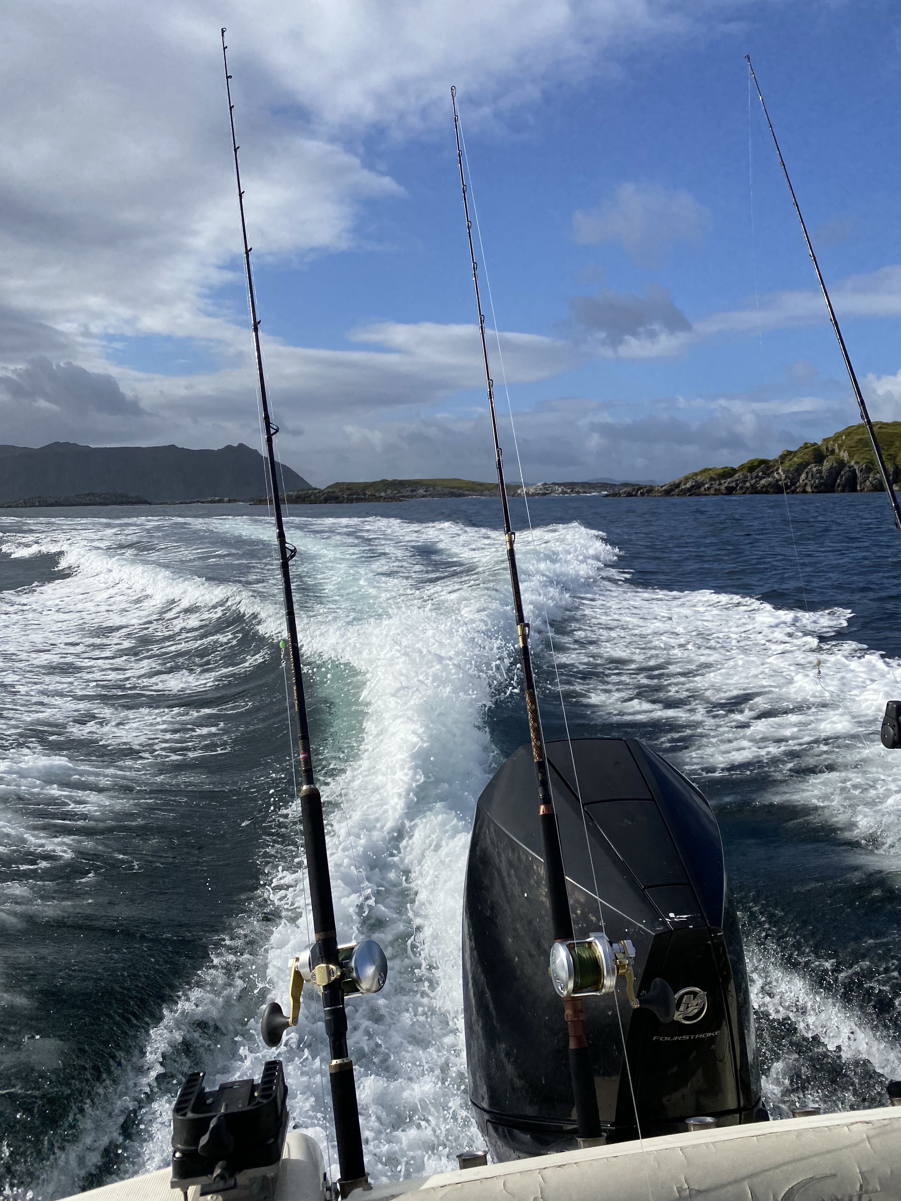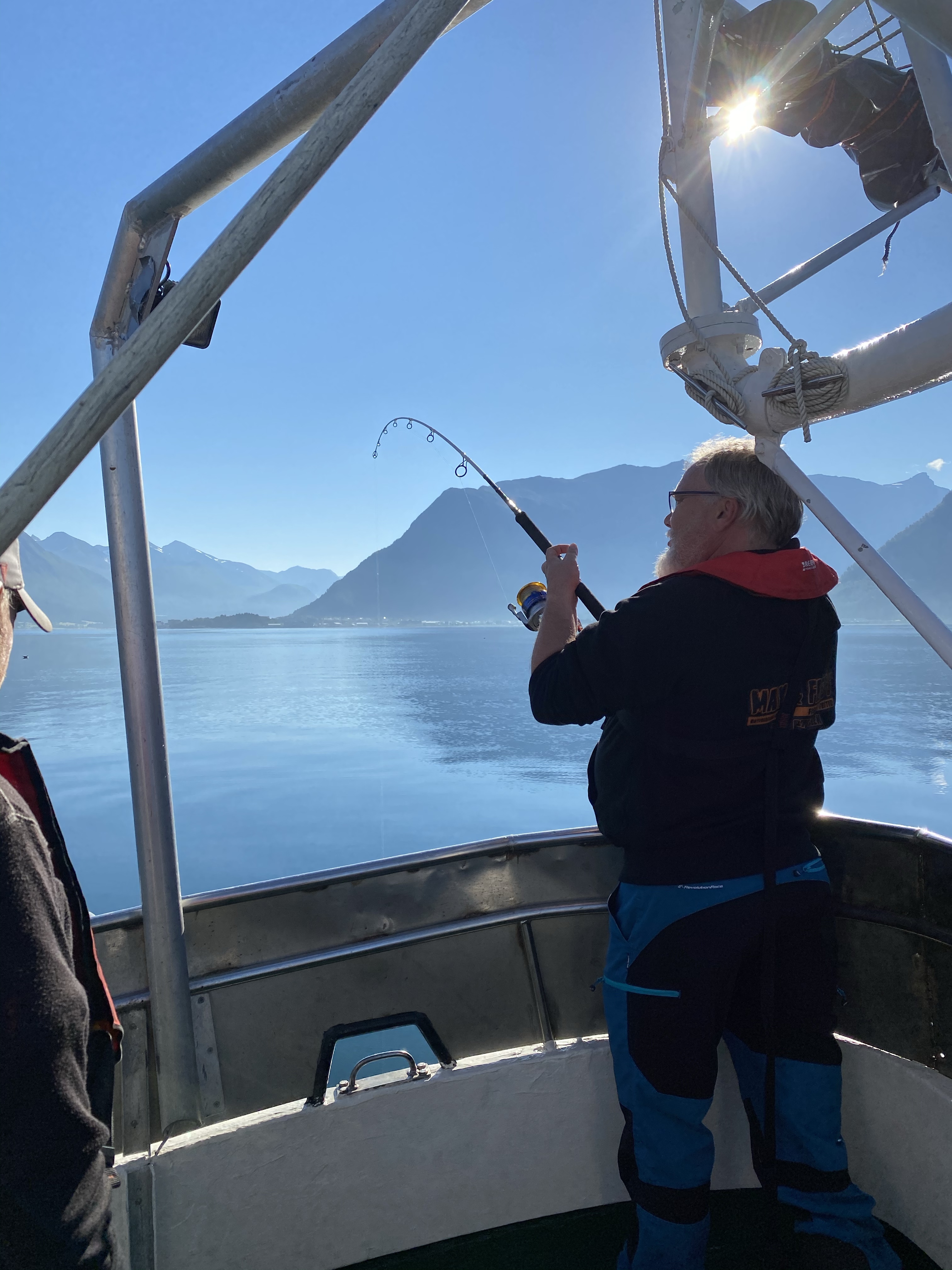 Uansett var det bære å stelle seg ved ripa og slæppe uti. Bruker da agnsei på 500-1000g og et blyhuggu på 300g. Lyt vara såpass om en skar komma tell botten. Strømmen tar godt tak i båt og bait. Vi stopper motoren og driv i nesten to knop, så det blir en del fløttinger. Innimella får’n bære nyte utsikten