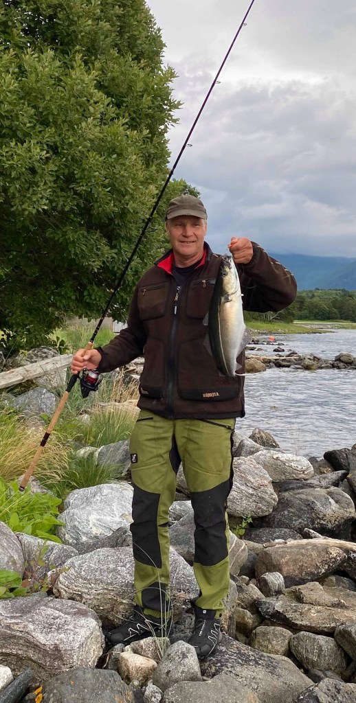 Itte lenge ætterpå var det nåe som høgg tak i agnet på stanga mi. Je var da itte istand om å få inn det som befann seg i andre enden, så’n Fred lyte ta over stanga å prøve hæn. Det gikk som det måtte det- spjoing- også vart det slakk line. Det var det je tenkte sa hæn- botten. Jaha, sa je, men hæn vart usikker hæn og da hæn fekk sjå åssen agnfisken min såg ut 🌞