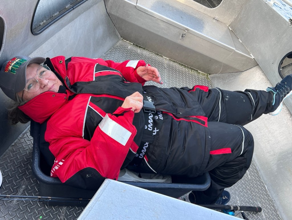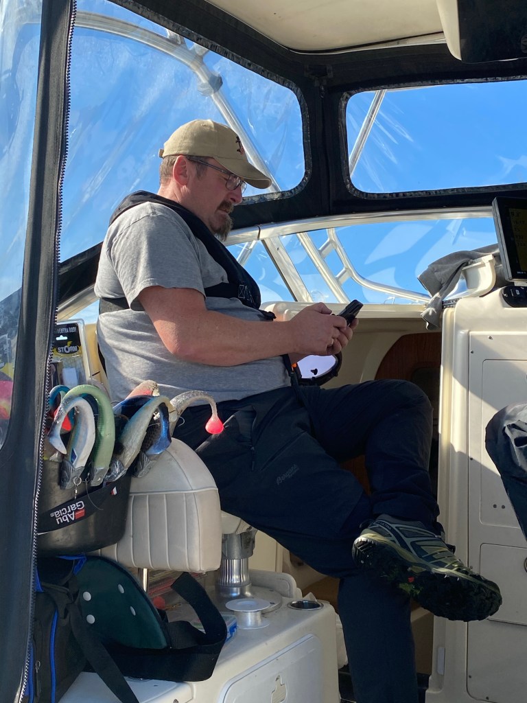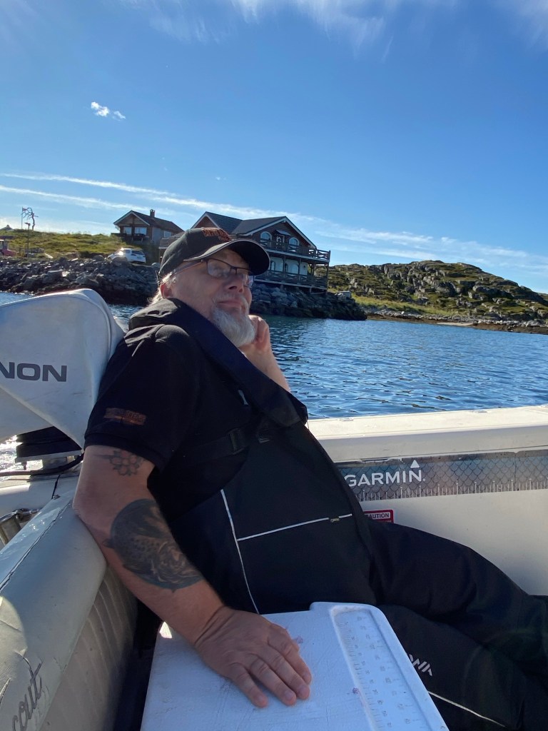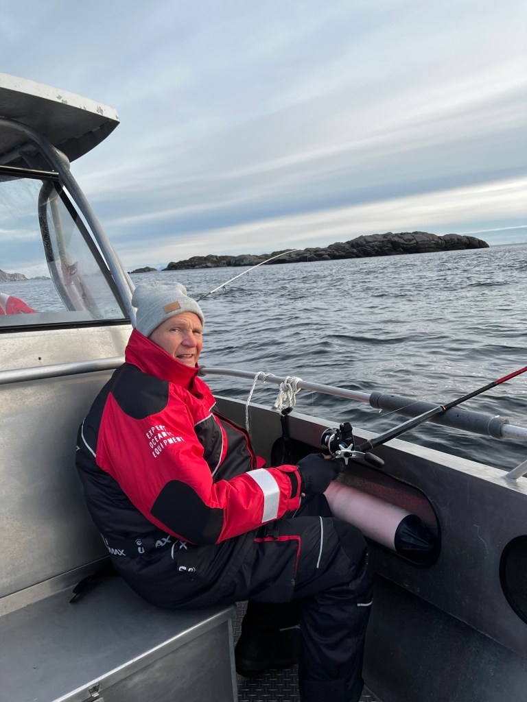 Så var det klart før å begynne å fiske-endelig. Litt trælete å få løs att gubben bak roret, men vi fekk da bytte plass. Det er mæssom undetegnede som er kaptein på slike turer a vøtt, også er det’n Fred som styrer med ælt som skar uti sjøen. ( UT har høllt på å havne der nåen gonger😬 ) Litt vanskelig å vælja å’n skar sætta ut fra gong tel gong, men får som regel bestæmt seg og tukle uti før vi er på raset. Må mæssom finna ut av el riggen og a vet du. Sea er det i grunn bære tut og kjør. UT har en evne tell å kjede seg litt når a sitt og styre, så netflix på tlf er igrunn kjekt, ell ??? Nope, det er det itte. Støtt og stadig blir je førstyrre midt i sendinga av nøern som brøle at det for trøen må gå an å sjå å henn je kjøre henn. Kjem innimellom nære lænd ell andre båter har blitt meg førtælt med streng stemme. Er da for pokker itte lett å kjøre båt når’n er midt i en film da ve.