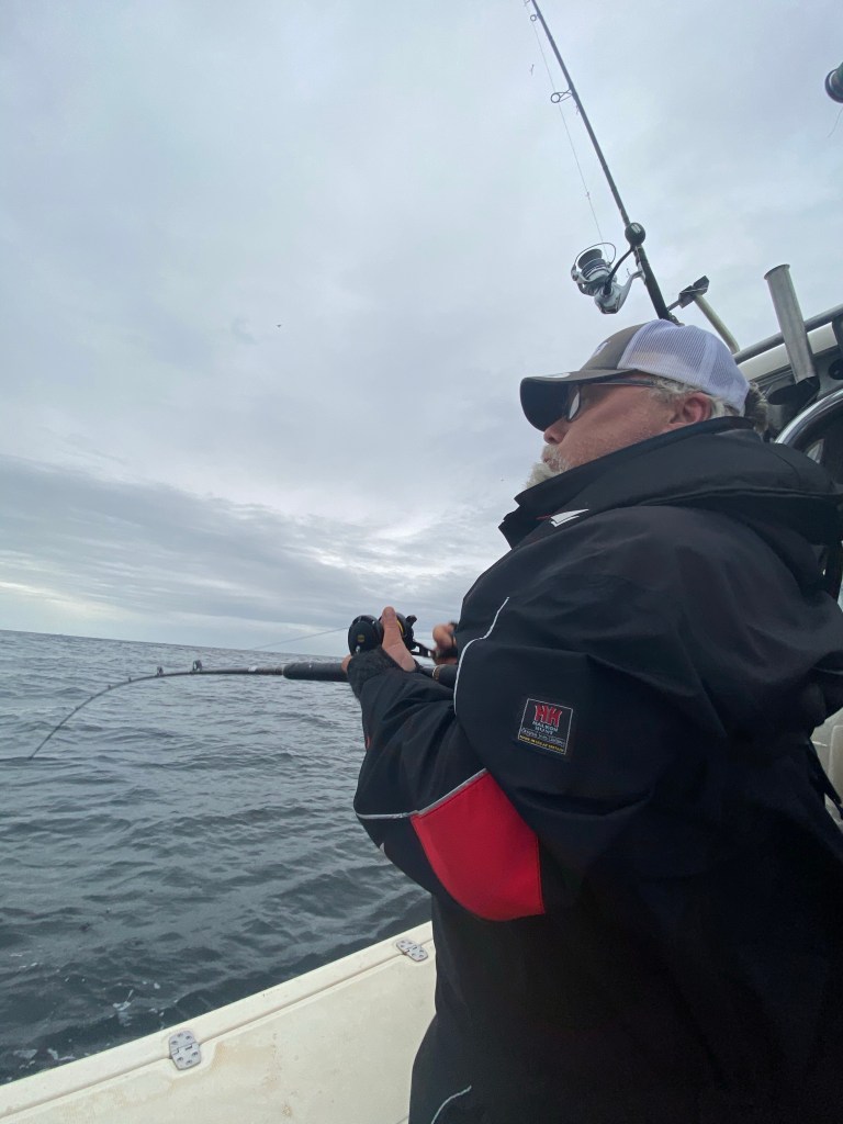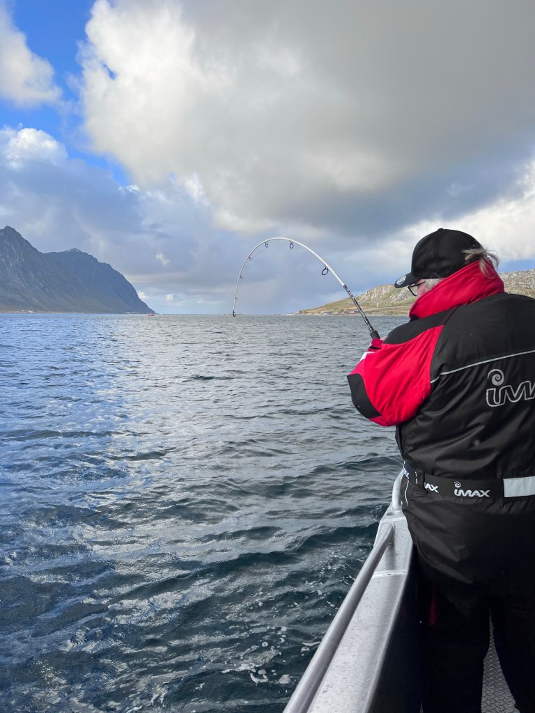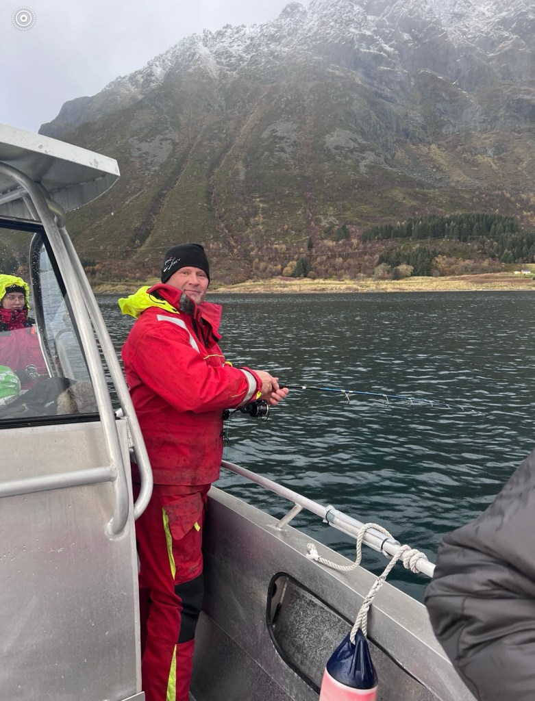 Slik har vi stått i noen timer, da gubben sier at je lyt fløtta meg. Jøssenam tenkte je, her har je sti i hele dag og nå står je plutselig i væga 😳 Men så sie’n at je må gå unna før at han har fisk. Diger fisk 👏👏 Je tar tlf og ringer guiden våres, før hæn har sagt vi må seja ifrå om vi trur det er diger fisk. Her trur vi itte sa je, vi vet. Hæn kjem da opp på sia tå båten våres og hoppe oppi før å hjelpe tell. Vart en æller så liten kamp.