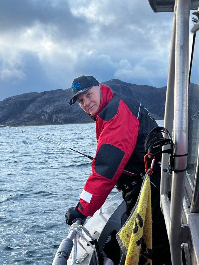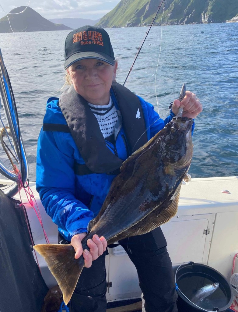 Ei god stønn ætterpå ser vi nabobåten kjørendes forbi øss. Itte fort, men i hastigheten til ei sinna kveite. Det har seg slik at om du får på ei diger kveite, så stikk a avgårde det a er kar om med kroken i kjeften. Da er det om å gjøre for fiskeren å prøve å følje på. Og når snella byne å gå tom for sene, ja da lyt’n kjøre båten ætter. Kveita kom tel slutt innått båten, men ville itte vara med opp. Rætt under overflata klart’a å rive seg løs, noe som førte tell noen høylytte forbannelser som itte egne seg på trykk. 20 minutts harde armbelastninger kæn gjøra slik med en 😓