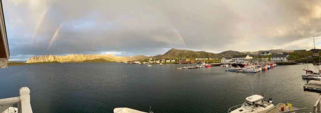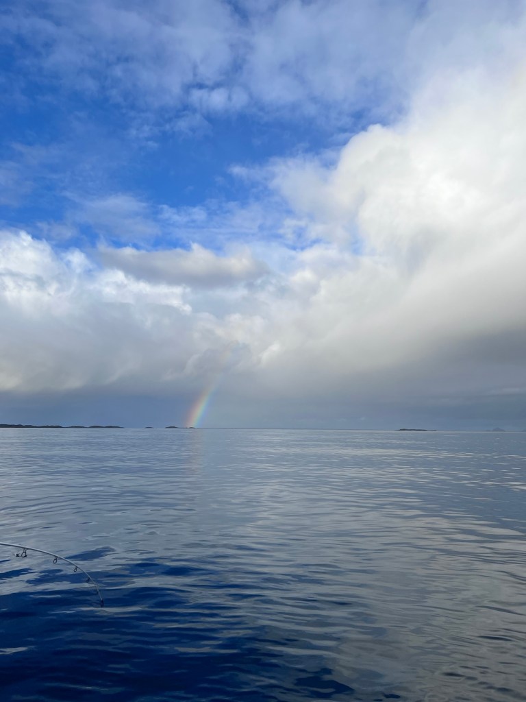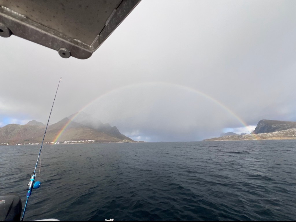Svært lite å fortælja om dessi daga her. Dag 5 var det igrunn slik passelig vær ifrå morran av. Vi fekk da låne en båt og mente å prøve øss utpå. Gikk fint tell vi kom ut frå havna, men så møtte vi både bøljer og vind. Vi drog likevæl oppi en plass som heter Nappstraumen. Var noen dykkere som hadde obsert ei kveite på +/- 100 kg der dagen før. Vinden tog itte så fælt oppi der hell. Litt regn slik av og på, men vi har kleer som tåle det. Regnbuen dukker fram sammen med sola og.🌞🌈