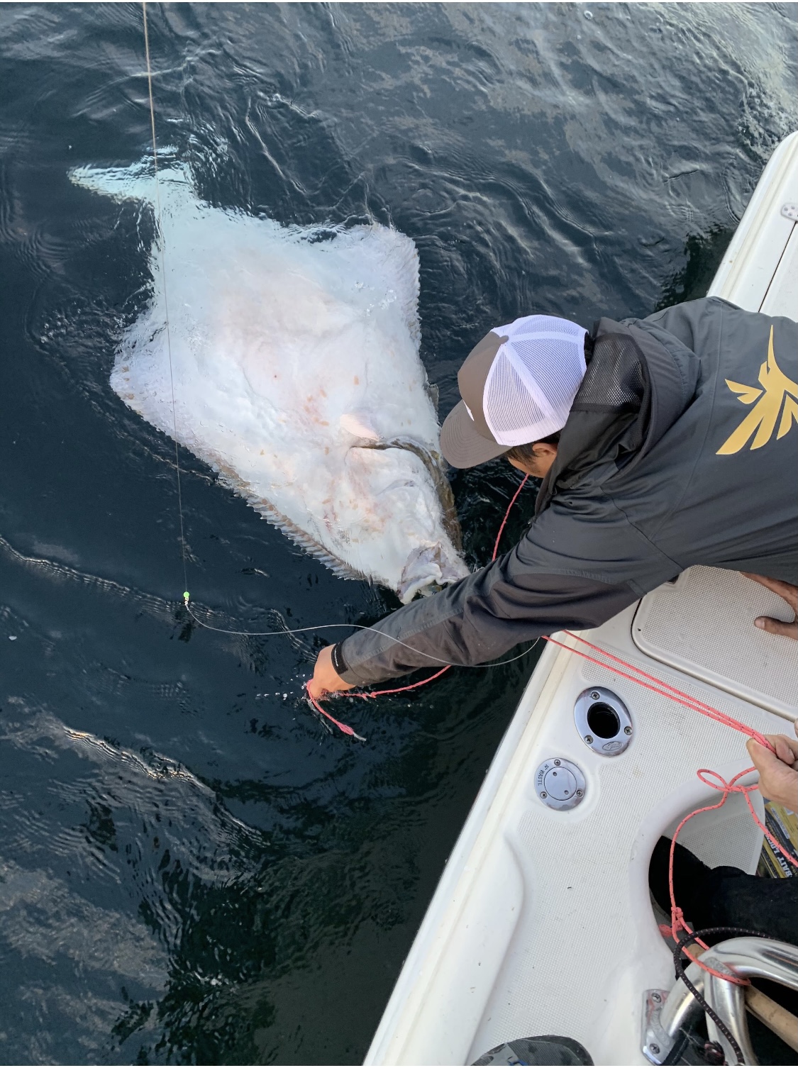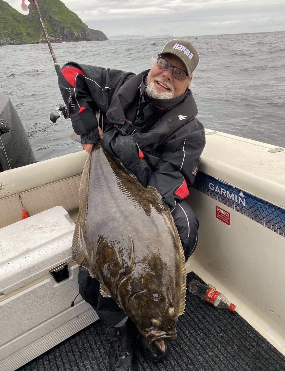Fred fekk iallfall premie for størst kveite inntil båten. Guiden anslo 170cm og ca 70 kg. ( kveita altså)