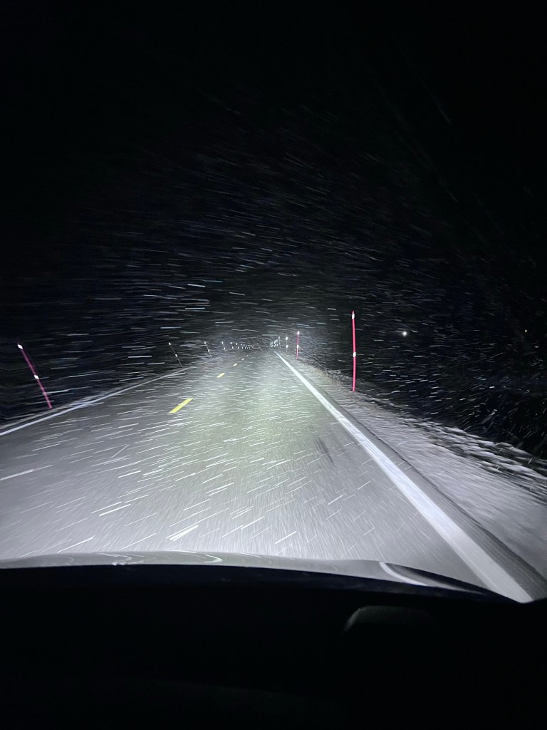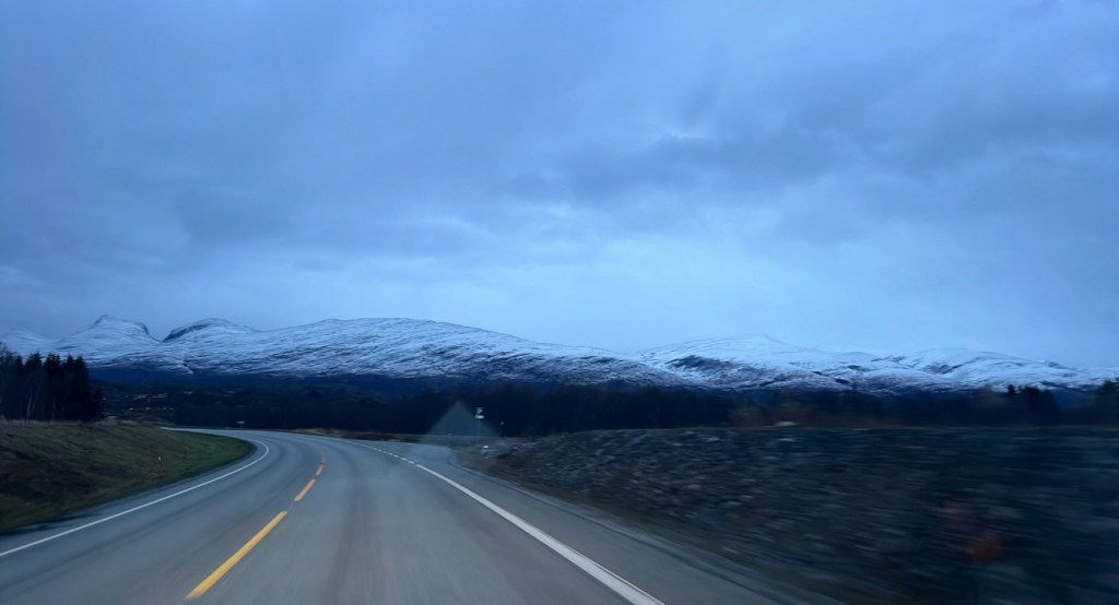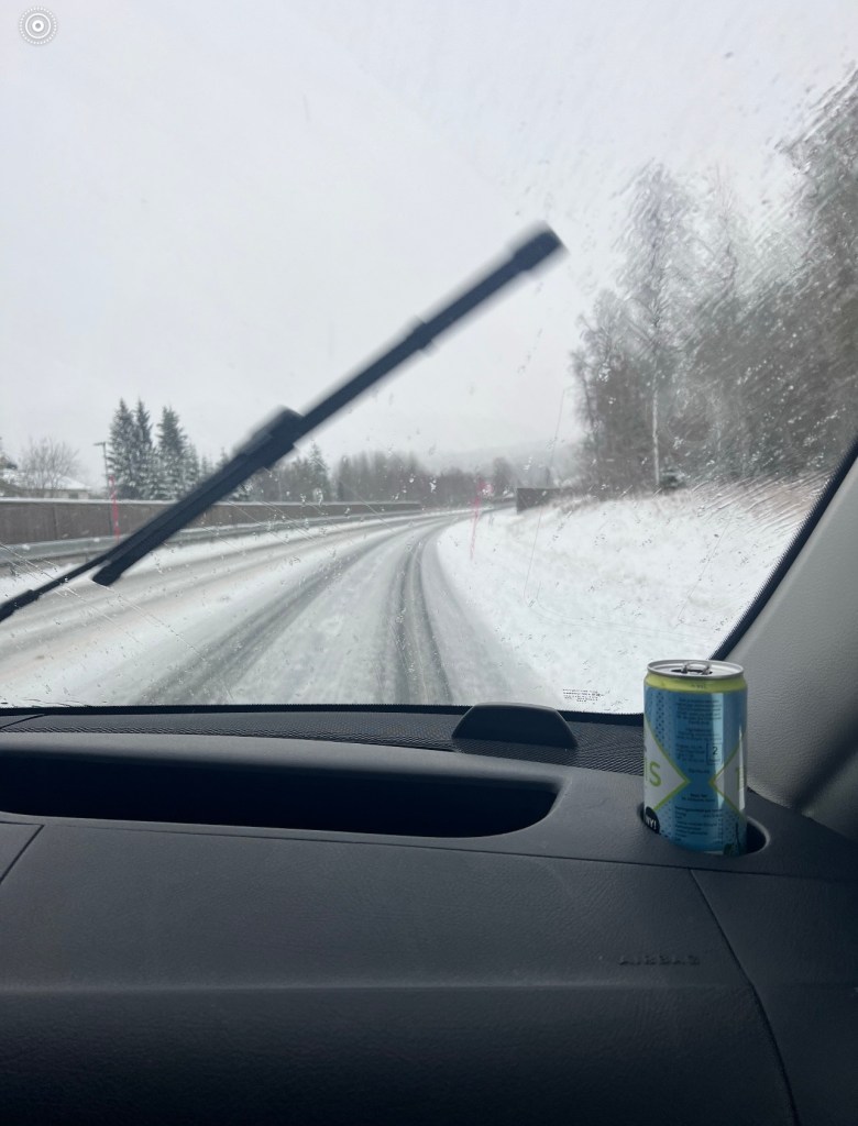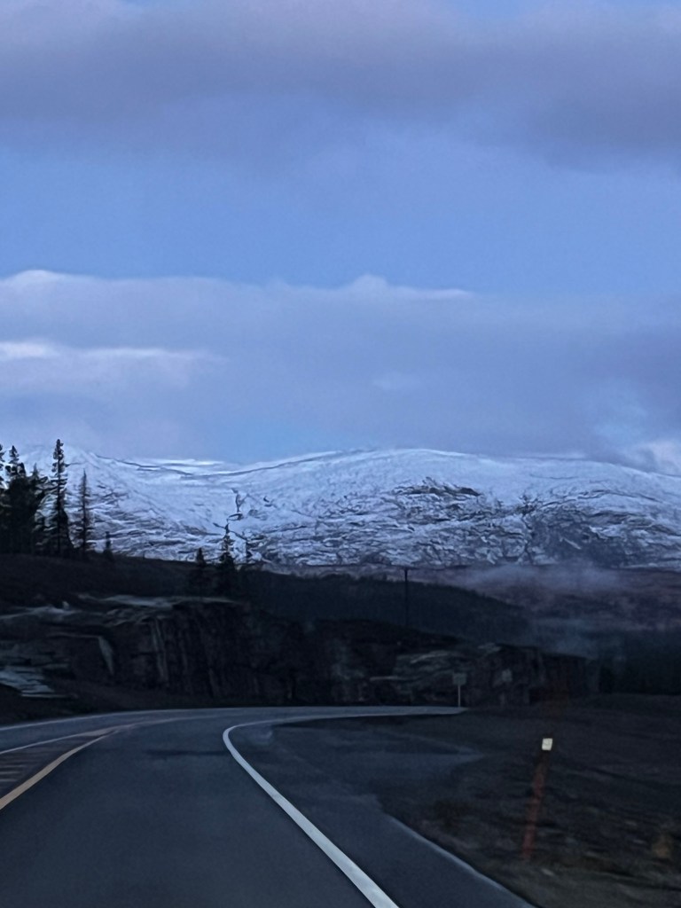 Omsider kom vi øss oppå Saltfjellet, men der høllt vi på å bli blåst av banen bokstavelig talt. Gubben, trøtt og fæl lyte hølle ti rattet med begge henda. Skifte fil innimella, med hjelp tå naturkreften, gjorde’n og 😬🌬️❄️💦💨 Fant ut at vi skulle stoppe på og prøve og sova en hælvtime. Je sjøl, gluphue, tenkte je skulle ut og skifte vatten, men i detta været vart det kun montering tå bånnplugg 🥶😶🌫️