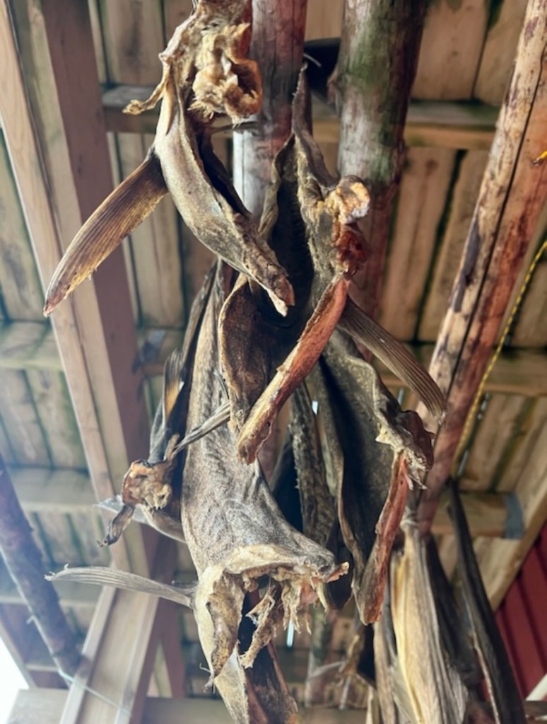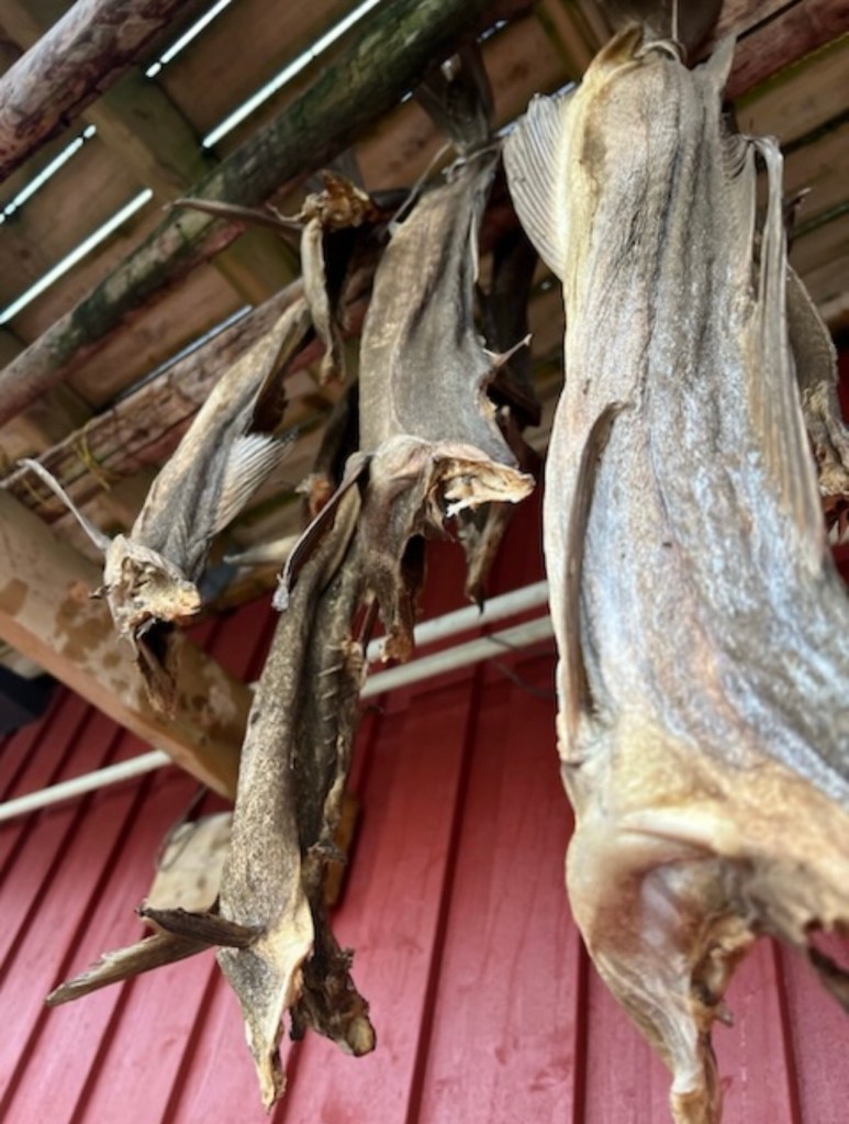 Vi kjem på en plass dom heng fisk ( til tørk) Lite fisk der nå riktignok 🥴