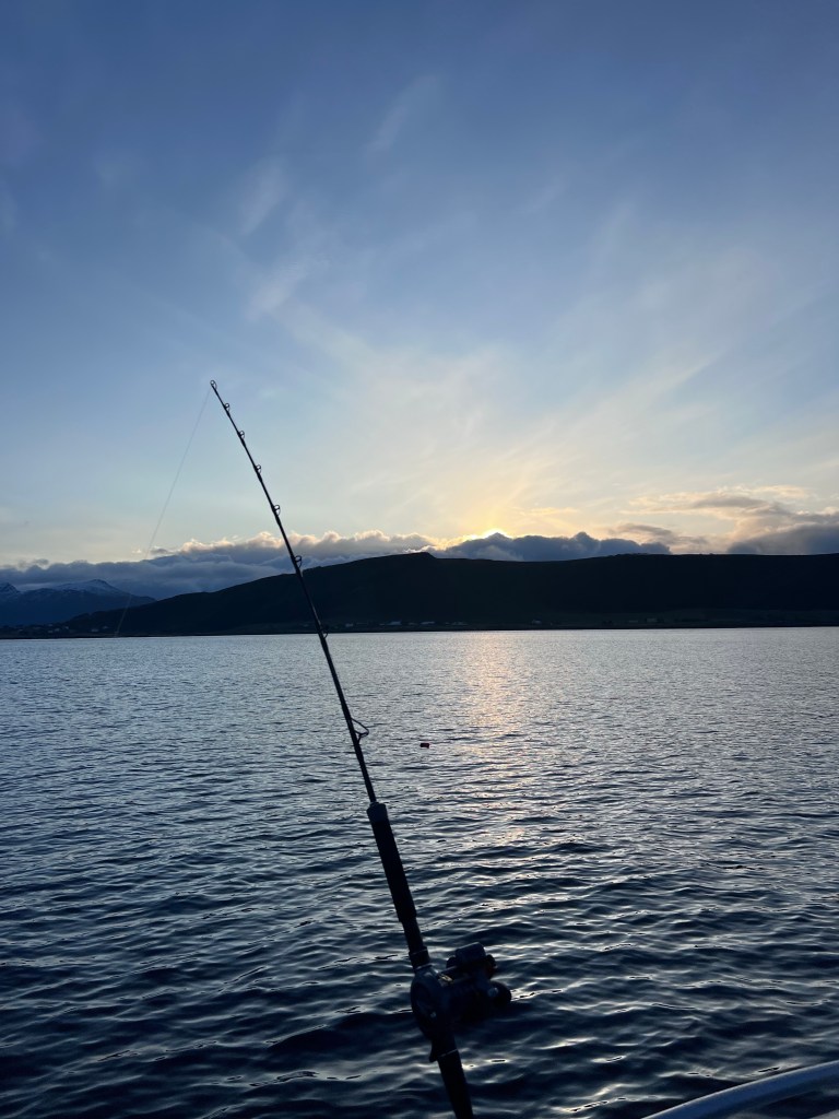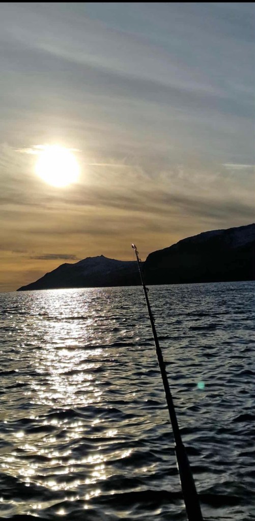 Så var det å kneppe på en agnfisk og hive over ripa. Så vente, og vente, og vente, og vente. Utrulig å kjedelig det blir etterhvert – å vente. Skar sejas at det er pent her nord, så natur’n underhøllt så godt’n kunne den 😍