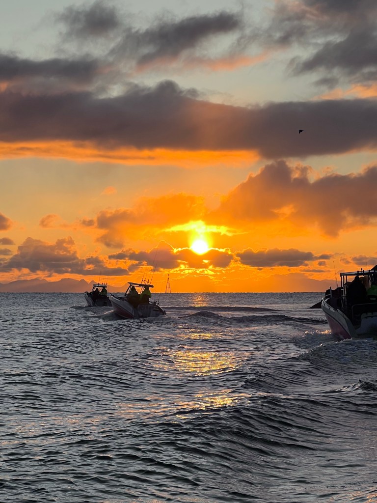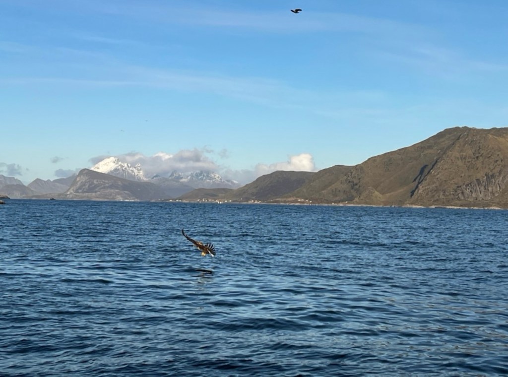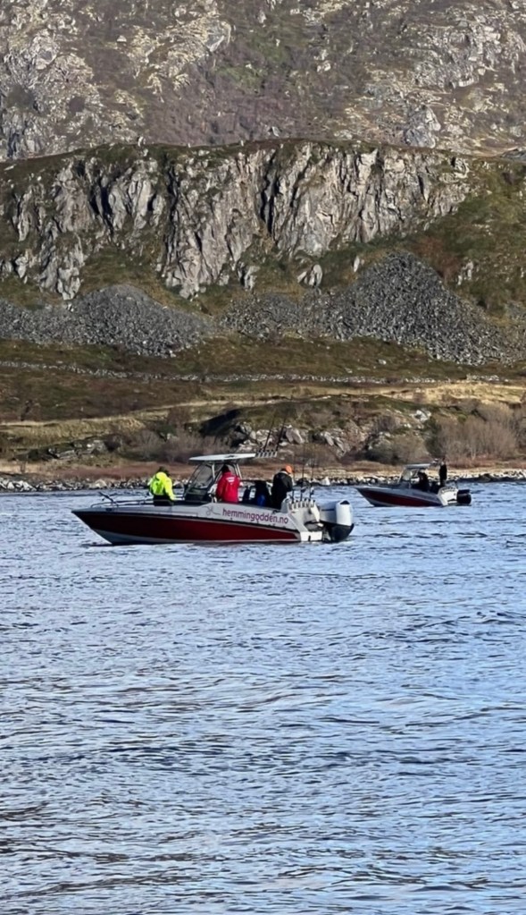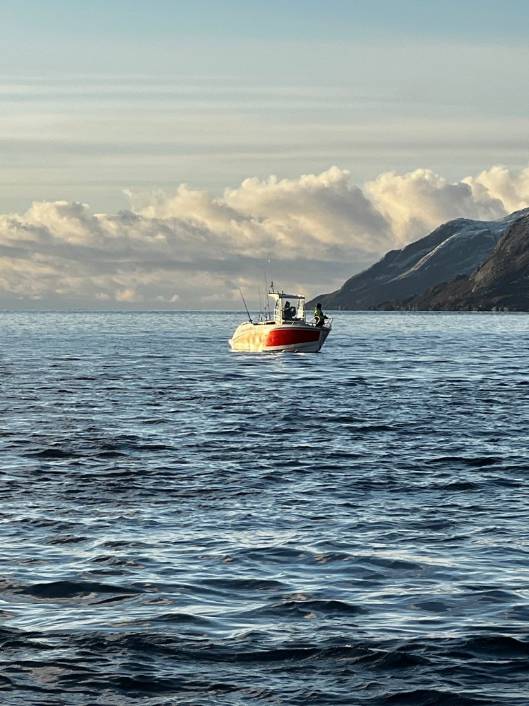 Dagen starter tidlig i dag og. Oppe som en ørn i sju tida, for vi skulle kjøre ut i åtte tida. Guiden vår Kato har tatt bilen for å sjekke forholda i Gimsøysundet. Det ligg en dryg time unna sjøvægen, så grett å væta om det er full storm der. Han gir beskjed om at det ser grett ut og at vi skar plukke’n opp der. Så da var det bære å kjøre utpå i gråværet. Tre båter ætter’n an.