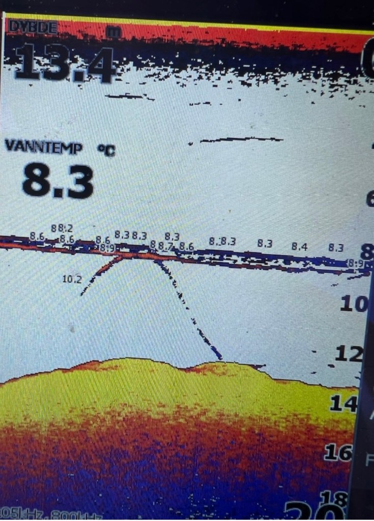 Uansett, vi starte med å lete etter agnfisk. Småsei trur vi at kveita vil ha. Er jo fader ittno anna her hell da så da må jo denna jævla flyndra eta det a får tenkje nå je🫡 Da vi har dri opp nåa slike var det bærre å agne opp og sleppe neri da. Og vente. Ser på ekkoloddet at vi har nåa nysjerrigperer som er oppom agnet, men det fallt visst itte i smak.
