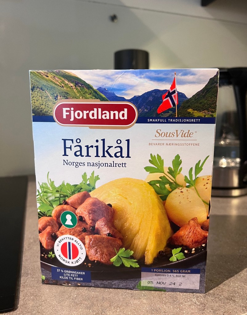 Endte opp med å handle med øss mæddan og. Itte akkurat terningkast 6. Her har nok Fjordland glømt å telsetta både kjøtt og smak. Inneholdt en 6-7 små gaffelbætar med kjøtt og en kålbit. Stusslig rætt og slett