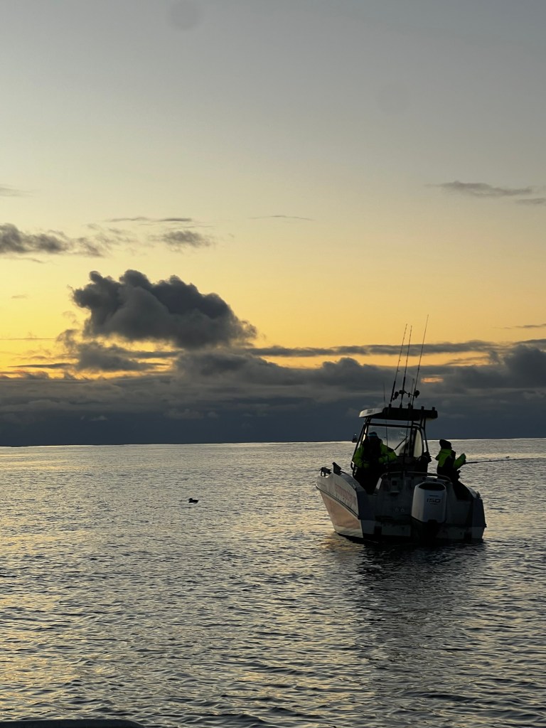 Etter dryge 6 timer utpå bynte det å blåse opp og regne såpass at vi bestæmte øss for å rese inn att. Er ca en halv times kjøring i 25 knop inn tell havna og. Magan bynte å gi beskjed om at vi itte hadde eti frokost enda og, så etter et lite klesbytte vart det hamburger på bensinstasjon. Sea på kvelden fikses det litt på utstyr etter dagen. Imorra krysse vi fingra for lite vind slik at vi kæn kjøre tell en anna fjordarm for å sjå etter kveita der 🤞